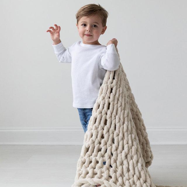 Everything about our new Infinite Chunky Knit blanket is elevated! With a softer, ultra-thick minky yarn and gorgeous new color palette, this blanket will be your favorite go-to-gift blanket. Organza gift bags are included with big and little size Infinite Chunky Knit blankets!